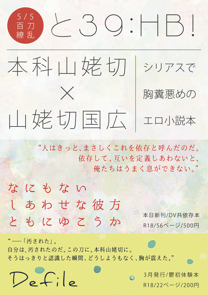 そもそも『山姥を~』で書いたような、どっちにも山姥退治の伝説がついてるせいでどっちが山姥を切ったのかよくわかんなくなってる本科と写しってすげえ沼だよなあって思ってて(まあまんばの台詞的に公式としては本科だけが山姥を切ってそうなんですけど未確定なので都合よくこじつけます)、でもそれ本科的には自分の呼び名が写しについた伝説から逆輸入されてつけられたものかもしれないとなれば、そしてその写しが時に自分よりも評価されることすらある程美しい見目をしているとなれば、それはもう性格によってはこじらせ待ったなしだし写しに当たったりすることもあるかもしれないしでもそこで写しの方は本科をよく思っててだからこそ自分が存在したせいで本科がこじらせてしまっているという事実が苦しいしどうにかできるならいくらでもどうにかしたいっていう献身が生まれてそれが本科へと返されてしまった日にはもうDV共依存待ったなしじゃんな……ってものすごい発想が飛躍して自分で萌え滾ったので自分でそれをそのまま書きましたというアレです。つまりは俺得本です。もう完全に好きなようにやりすぎてるんですが楽しめそうな人に楽しんで頂けると嬉しいです。よろしくお願いします!