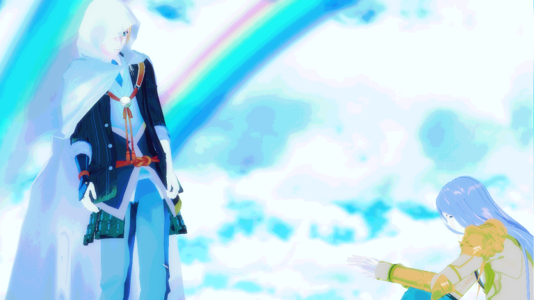 まんばが男性モーション側なのは、まんばが出てるエンゼルフィッシュってまんばが女性モーション(手を差し伸べられる方)なのが多いなあって思ってたので男性モーションの方で布がバッサバッサしてるの見たいなあって思ってそうしたのと、動画の流れを考えてて「それぞれ色々抱えてるけど出会ってない(=一人だったり背中合わせだったり)→本丸で出会うけど主にまんばがハニーに対して距離おいてる(本丸のシーンだったりとか2番サビ前でハニーと目があったまんばがすぐ俯く→ハニーも俯いてからちらっとハニーの方を向いてたりとか)→ハニーはそんなまんばのことを気にしてて仲良くしたいなあって思ってる(ちらちら見てたりずっと楽しそうだったり)→手を差し伸べるくだりで打ち解けてラスサビ、って流れにしたいなあ」と思ったときに、この流れだったらハニーがまんばに向かって手を伸ばすよりまんばがハニーに向かって手を伸ばした方がいいんじゃないか、それでやっとまんばがそうしてくれたって嬉しくなりながらその手を冗談でも払わずに素直に取るハニーめっちゃよくないかと思ってまんばをソッチ側にしたのと、あと単純に男性モーション読ませた時に蜂須賀さんの髪が結構あらぶっててこれは修正し慣れてるまんばの布の方が楽なんじゃないかと思ったのとってアレです。ほんと勢いで作ったので色々拙いんですけど、コメントから結構細かいところまで見てくださっているんだなあってことがわかって本当に嬉しいです。そのうち時間あったら修正版でも作りたい。