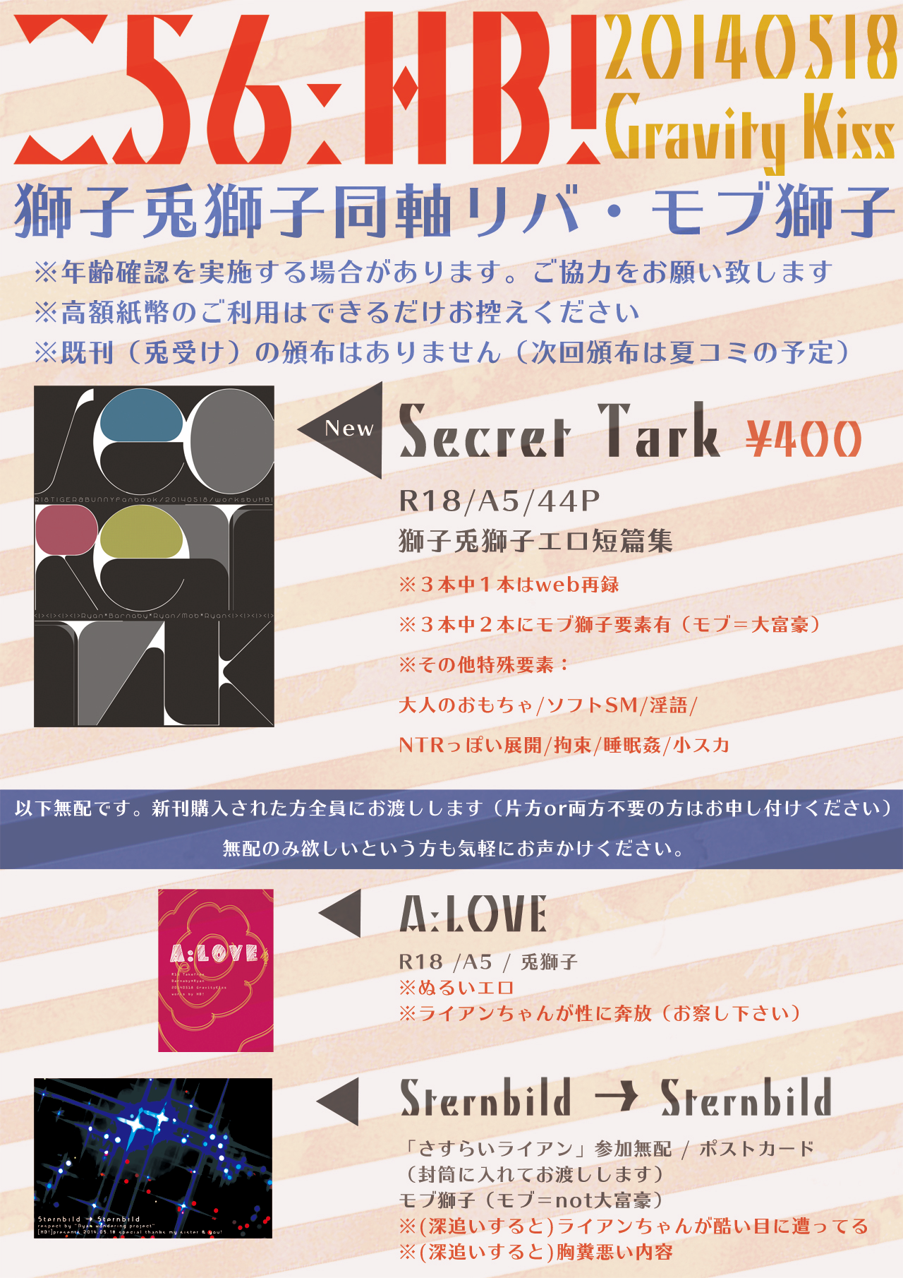 また画像には追加できなかったというかお品書き上げた後で増えちゃったんですが、ページ数合わせで2ページ埋めるのに突っ込んだ書きかけネタが龍×兎前提の龍×獅子になりかけて(私の頭の中で)3P突入未遂みたいなひでー内容のアレです。最初の1ページと該当ページの両方に注意書き入れてますので苦手な方はそこだけ飛ばしてくださいすみません。兎獅子は兎獅子で完結しているので兎獅子だけで十分読めます。また書きかけなのでこれのみピクシブへの再録はありませんが、後日完成しましたらちゃんと全文投稿する予定です