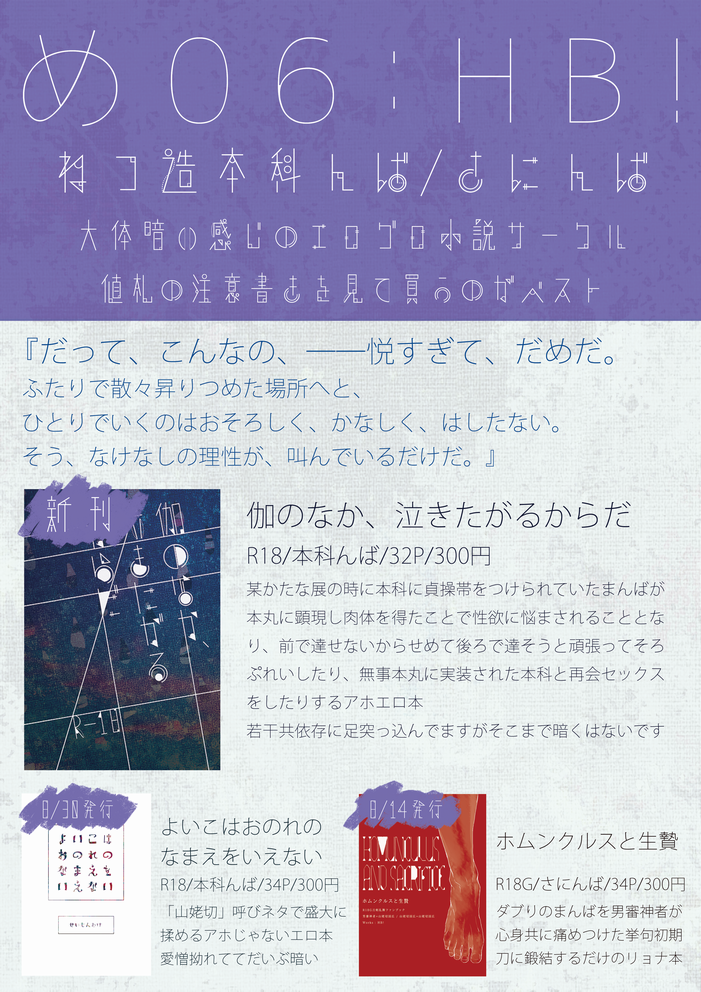 夏コミのさにんばみたく特殊性癖てんこもりってわけではないけどこれはこれで人を選ぶと思うので受け容れられるか不安です!!!ドヒャー!!!よろしくお願いします!!!!!!