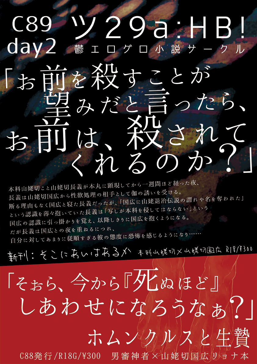 無配はついったの方に上げたのでこちらからどうぞ。また在庫状況ですが、新刊と8月閃華のほんかんばちゃん本のイベント分が完売しました。ありがとうございました!夏コミで出したリョナ本はちょっと残ってるので次のイベントにも持って行きます。
